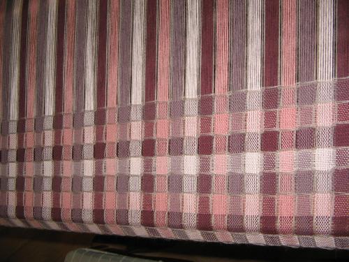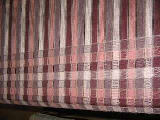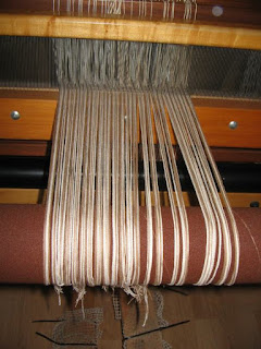 Here's a piece that I've just started to weave. It's a wide piece--~34"--about as wide as I like to go on my 36" loom. The plan is to weave differential double weave and have the cotton colors form bubbles as the wool (it's a tan--four threads between the cotton colors) shrinks. We'll see if things go according to plan!
