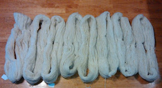 The fleece yielded 8 skeins of 2-ply yarn, 200-300 yds per skein. That's 1600-2400 yds of yarn. :)